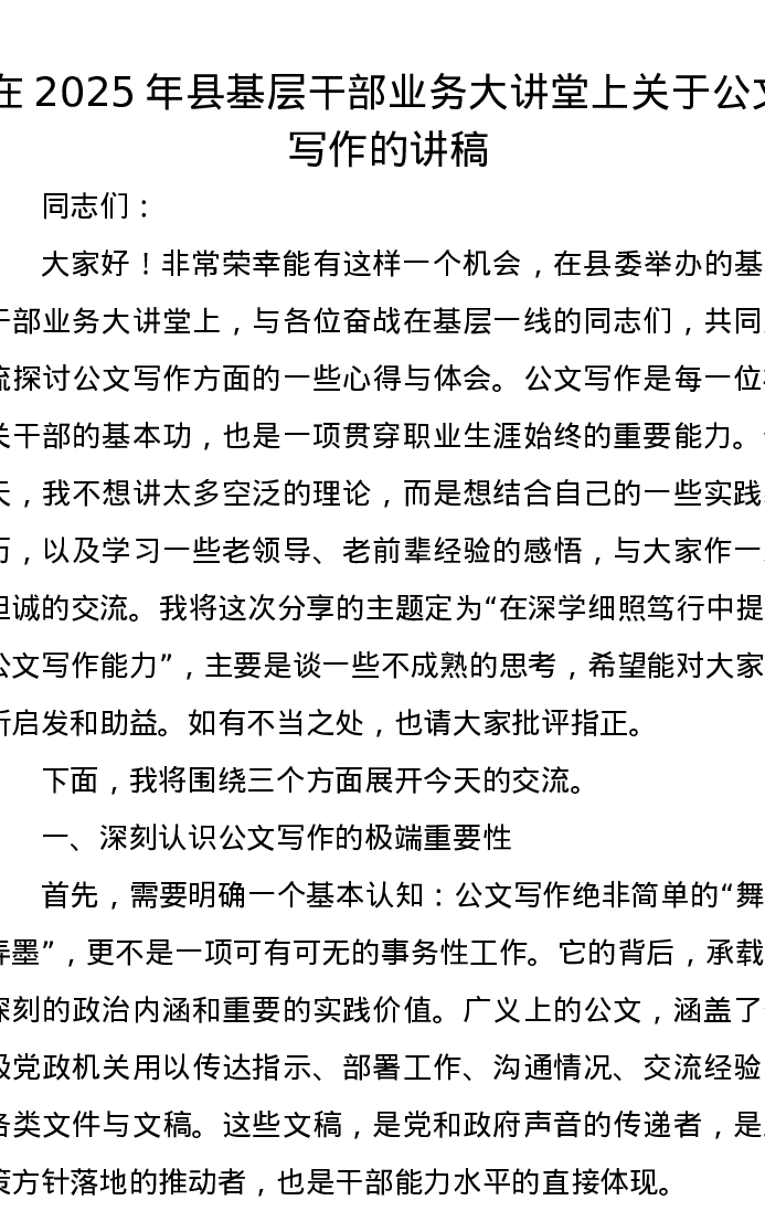 在2025年县基层干部业务大讲堂上关于公文写作的讲稿