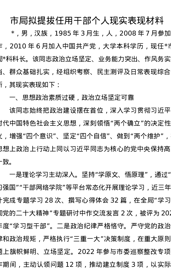 市局拟提拔任用干部个人现实表现材料
