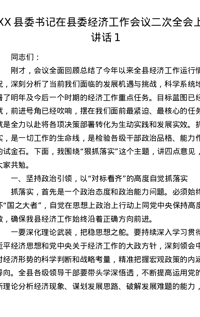 XX县委书记在县委经济工作会议二次全会上的讲话1