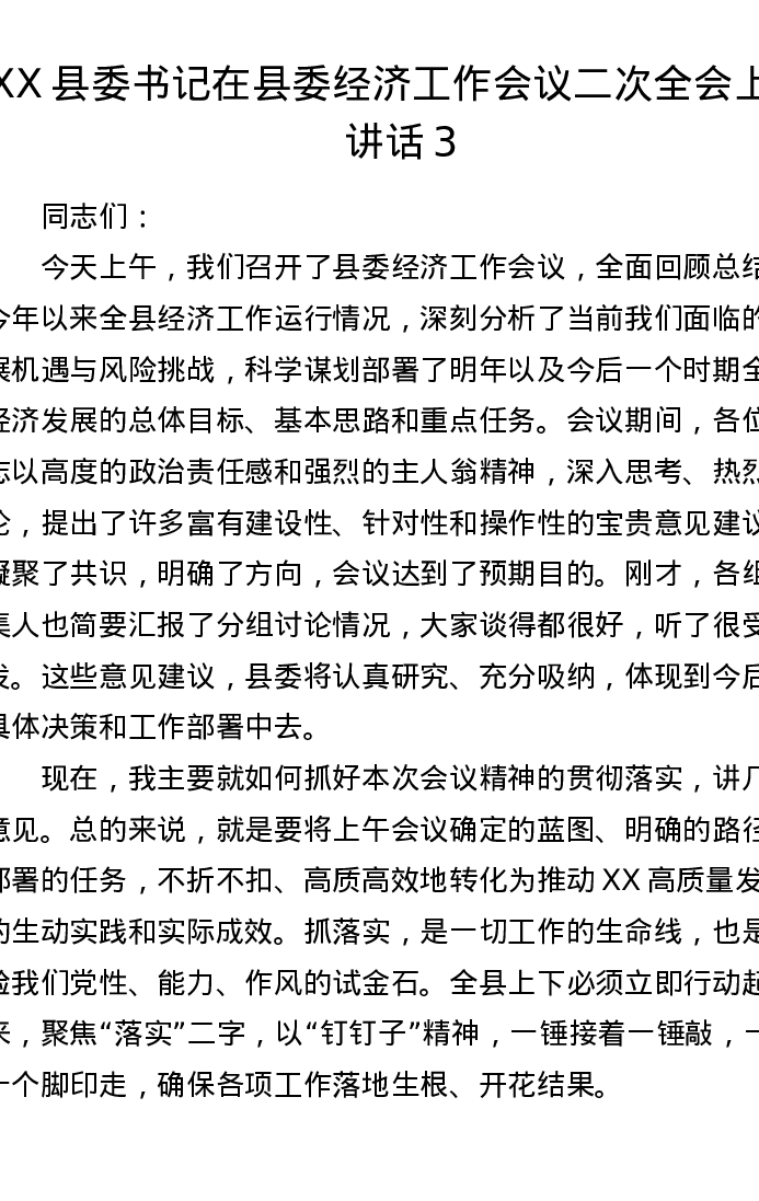 XX县委书记在县委经济工作会议二次全会上的讲话3