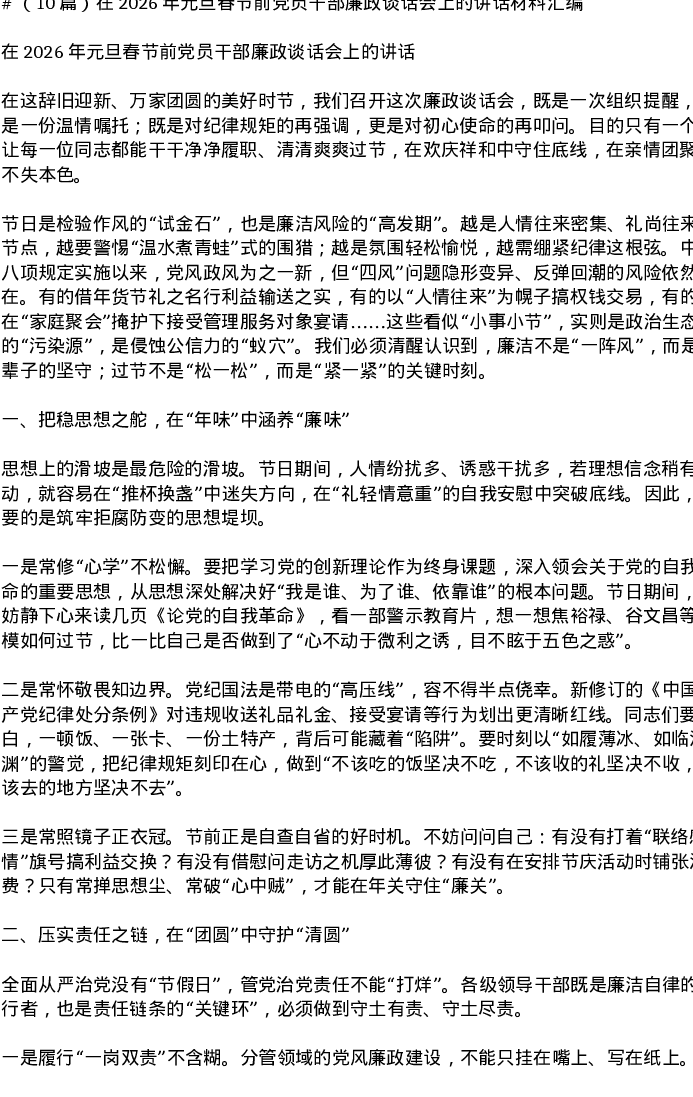 汇编:在2026年元旦春节前党员干部廉政谈话会上的讲话10篇