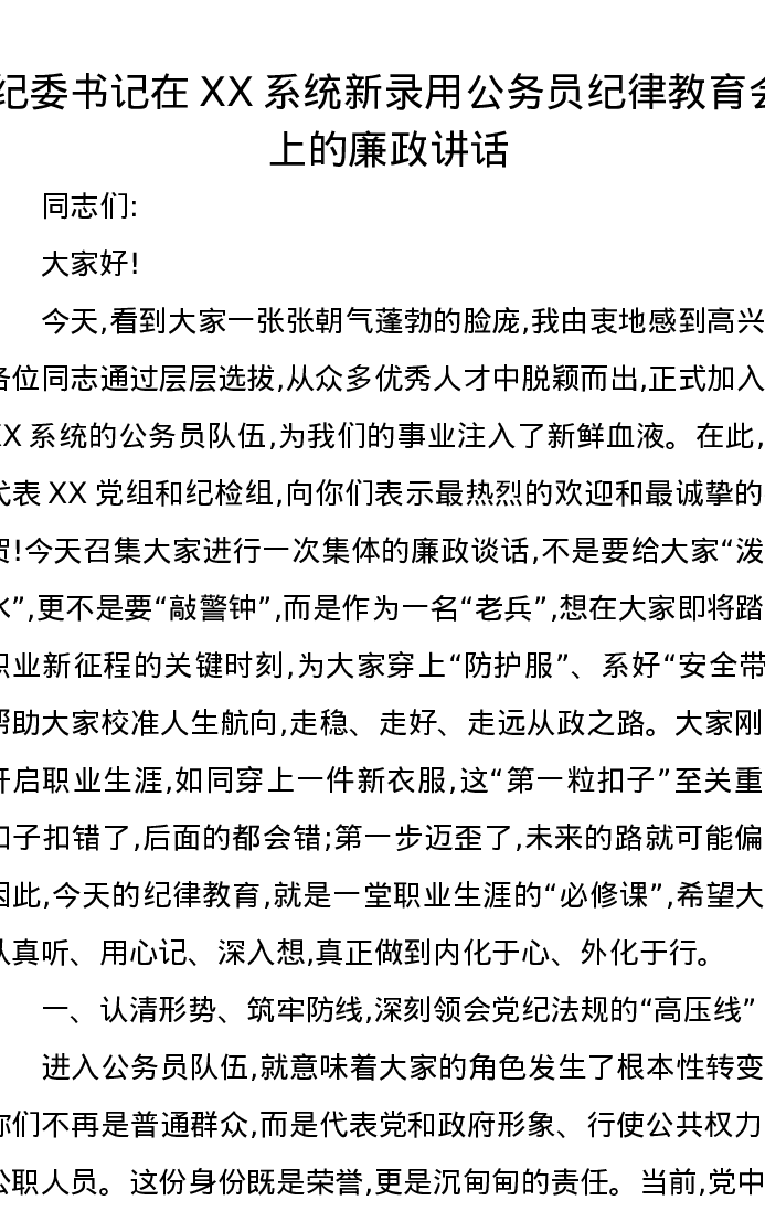 纪委书记在XX系统新录用公务员纪律教育会上的廉政讲话