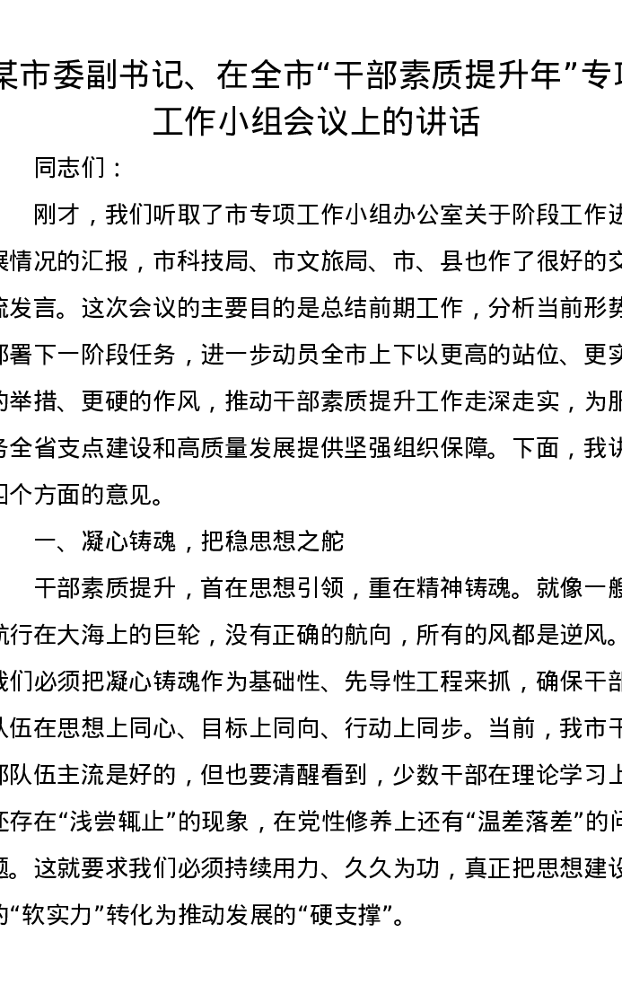 某市委副书记、在全市干部素质提升年专项工作小组会议上的讲话