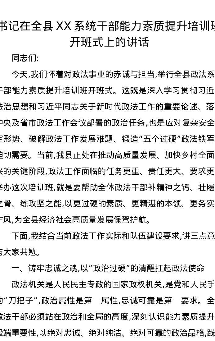 书记在全县XX系统干部能力素质提升培训班开班式上的讲话