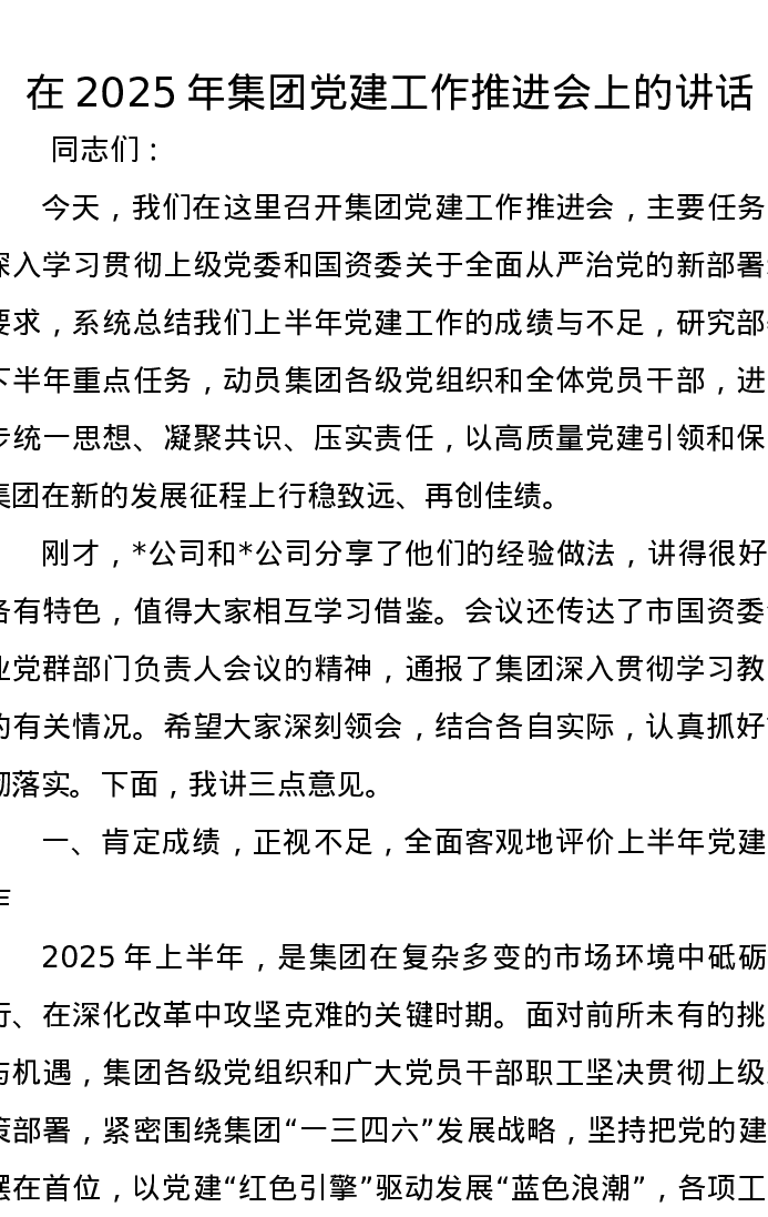 在2025年集团党建工作推进会上的讲话