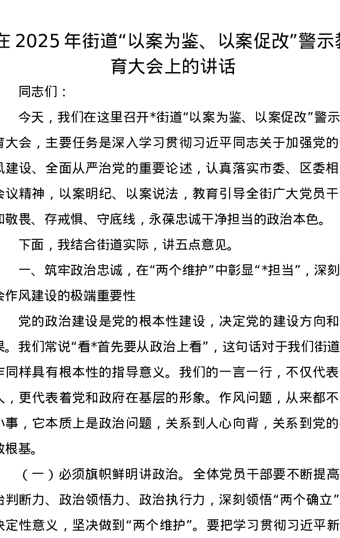 在2025年街道以案为鉴、以案促改警示教育大会上的讲话