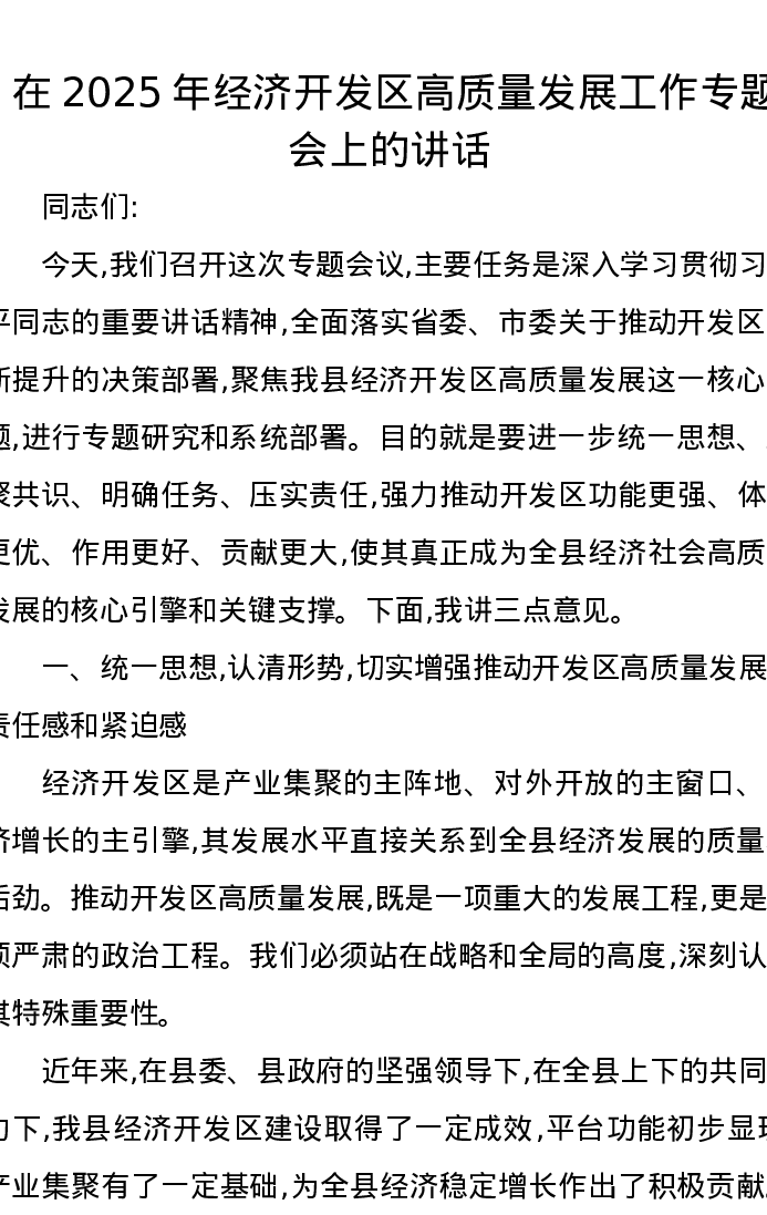 在2025年经济开发区高质量发展工作专题会上的讲话
