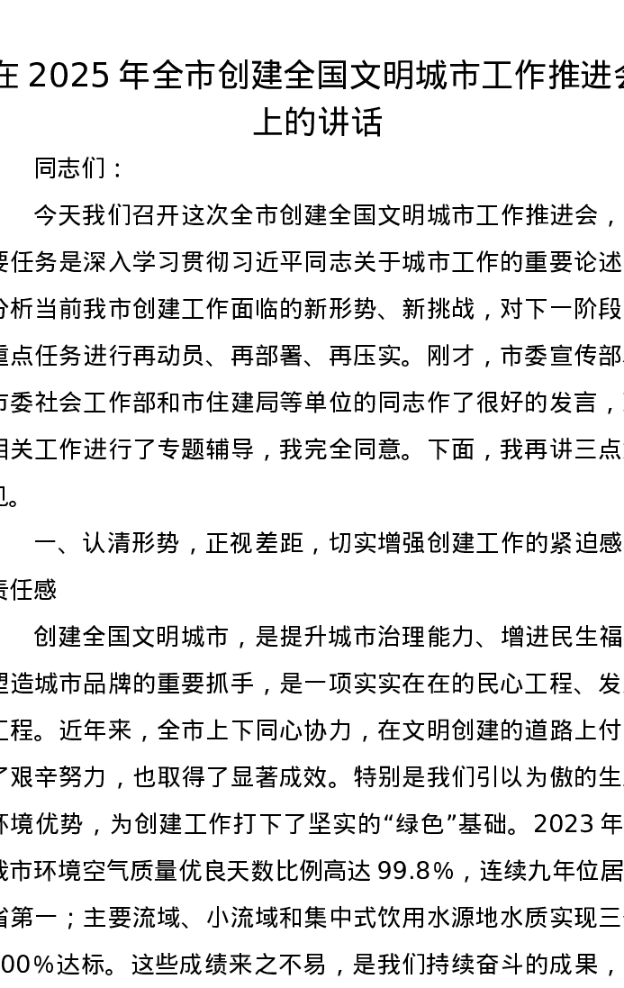 在2025年全市创建全国文明城市工作推进会上的讲话