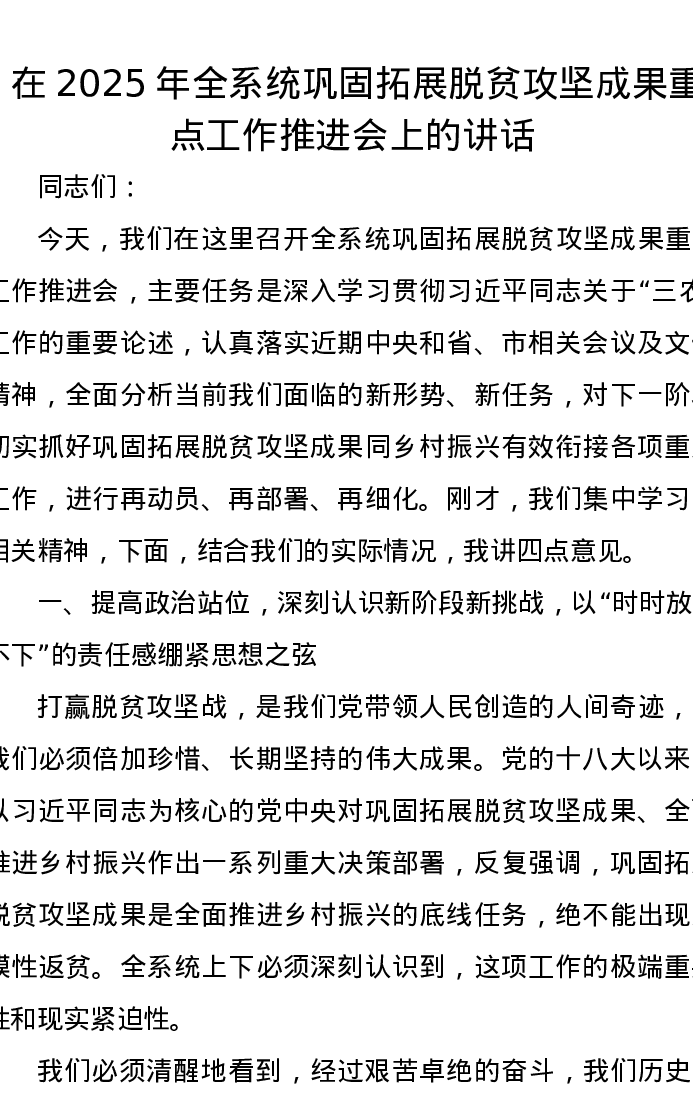 在2025年全系统巩固拓展脱贫攻坚成果重点工作推进会上的讲话
