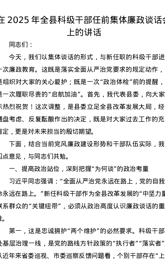 在2025年全县科级干部任前集体廉政谈话会上的讲话