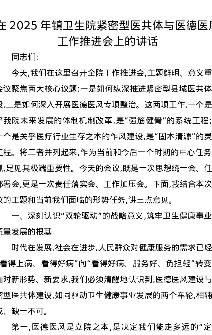 在2025年镇卫生院紧密型医共体与医德医风工作推进会上的讲话