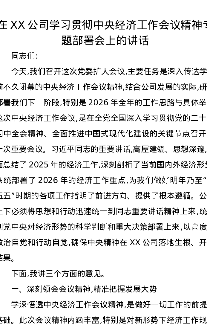 在XX公司学习贯彻中央经济工作会议精神专题部署会上的讲话