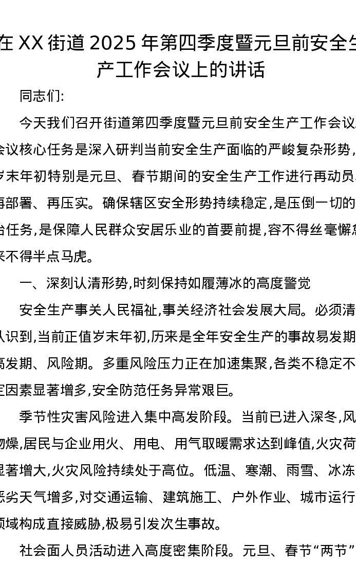在XX街道2025年第四季度暨元旦前安全生产工作会议上的讲话