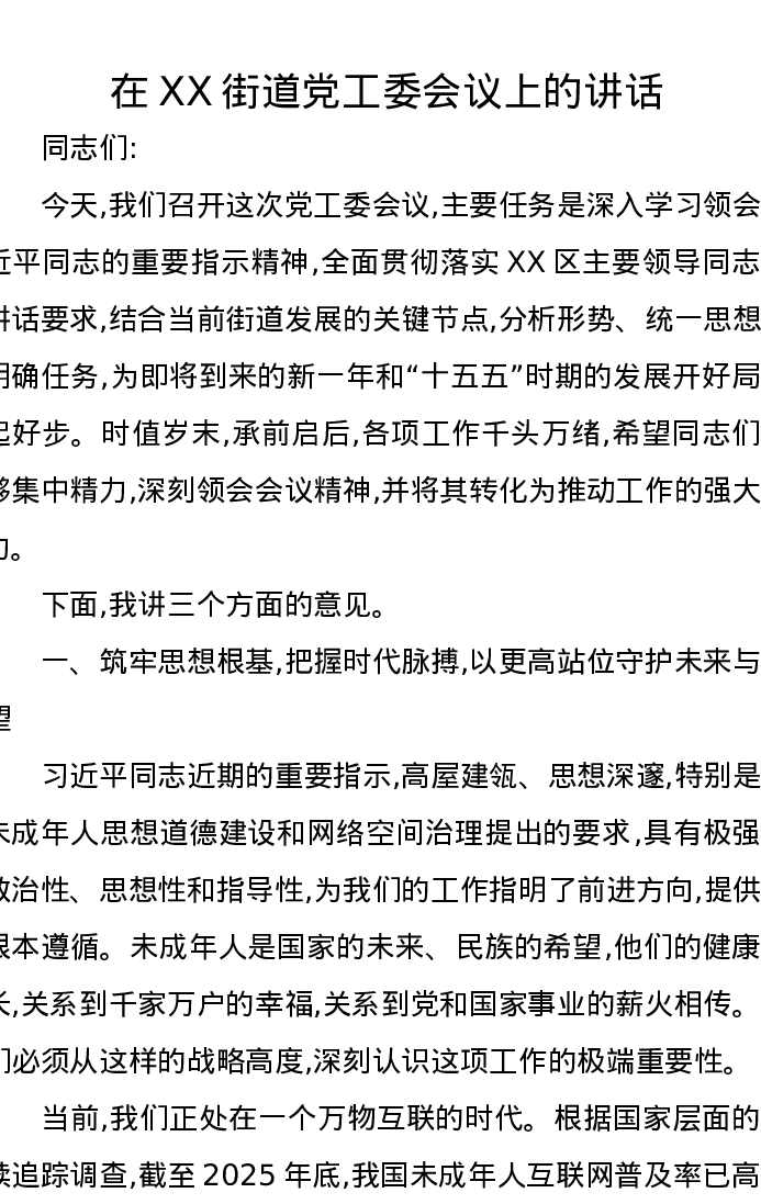 在XX街道党工委会议上的讲话