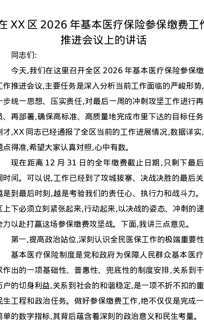 在XX区2026年基本医疗保险参保缴费工作推进会议上的讲话