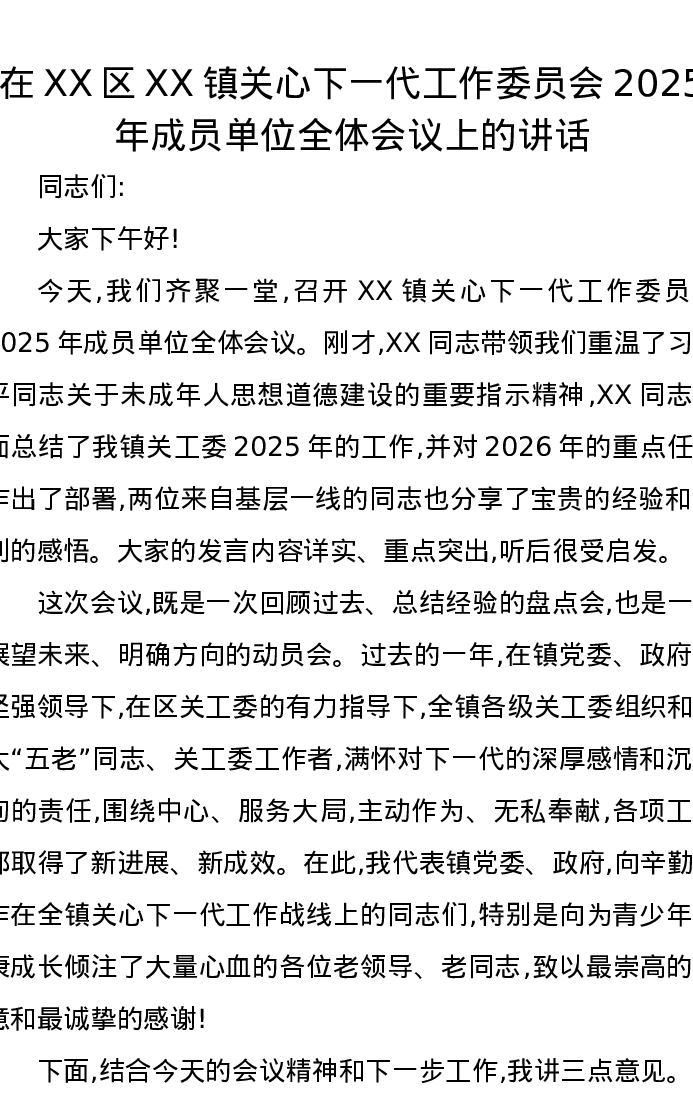 在XX区XX镇关心下一代工作委员会2025年成员单位全体会议上的讲话