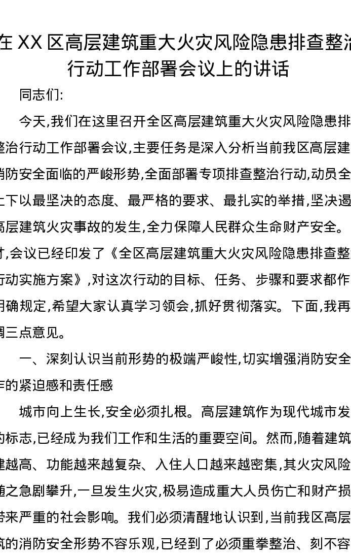 在XX区高层建筑重大火灾风险隐患排查整治行动工作部署会议上的讲话