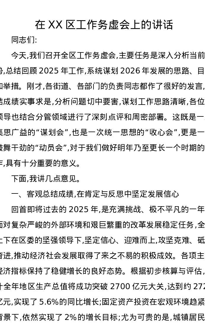 在XX区工作务虚会上的讲话