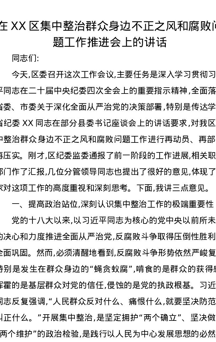 在XX区集中整治群众身边不正之风和腐败问题工作推进会上的讲话