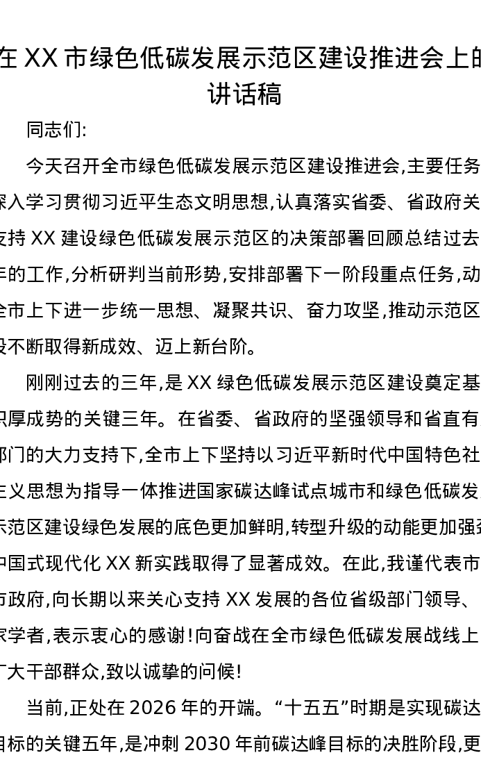 在XX市绿色低碳发展示范区建设推进会上的讲话稿