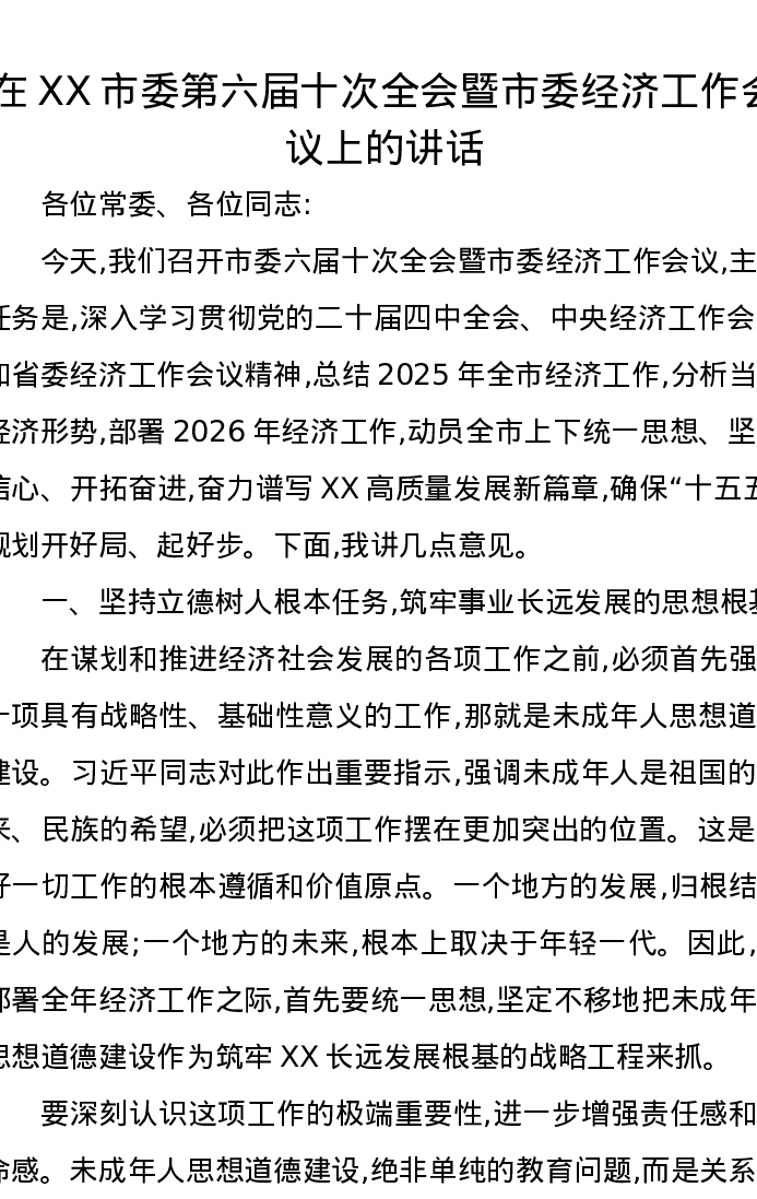 在XX市委第六届十次全会暨市委经济工作会议上的讲话