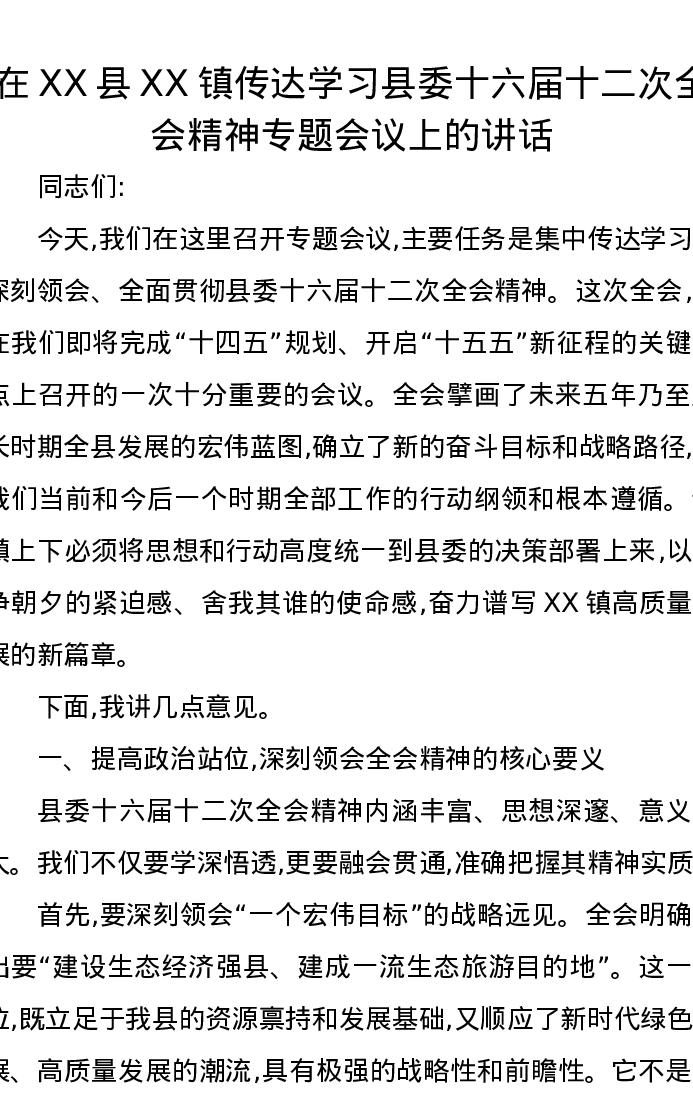 在XX县XX镇传达学习县委十六届十二次全会精神专题会议上的讲话