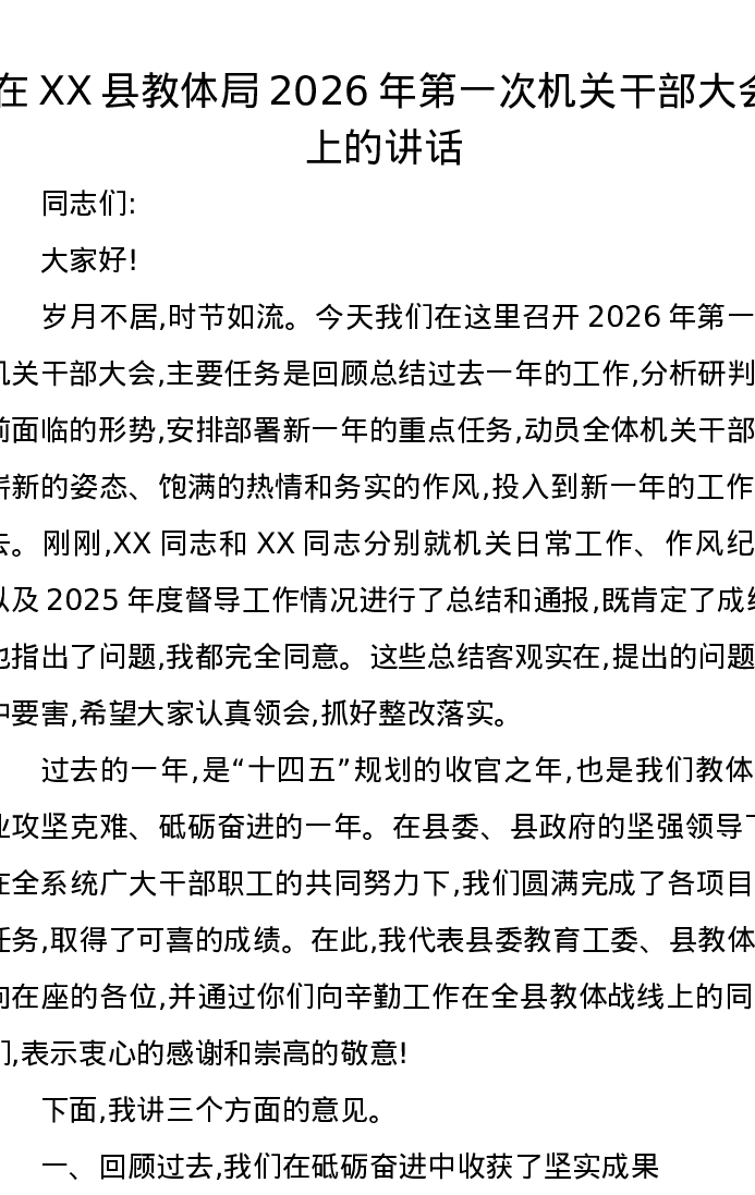 在XX县教体局2026年第一次机关干部大会上的讲话
