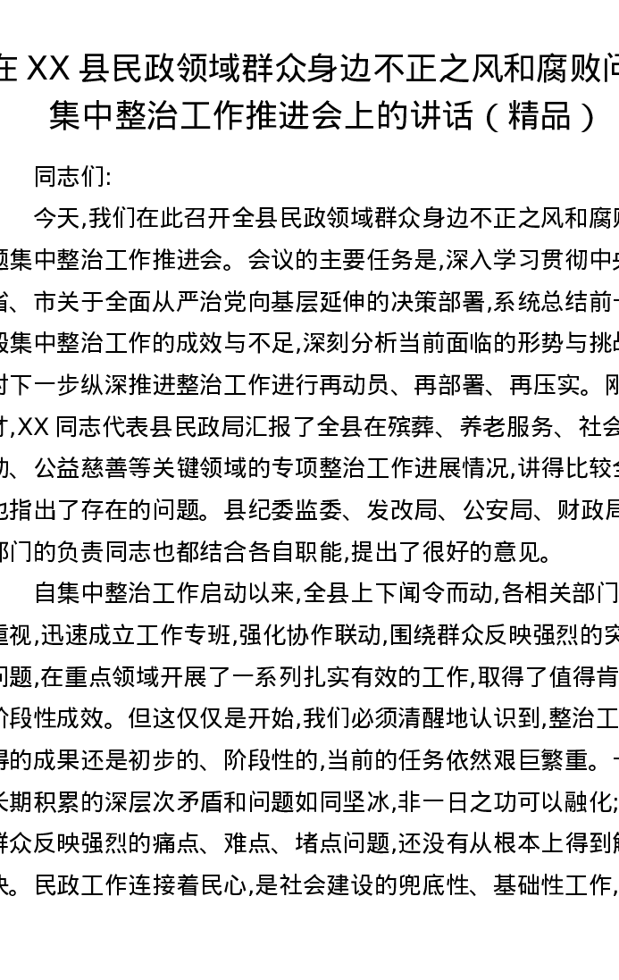 在XX县民政领域群众身边不正之风和腐败问题集中整治工作推进会上的讲话
