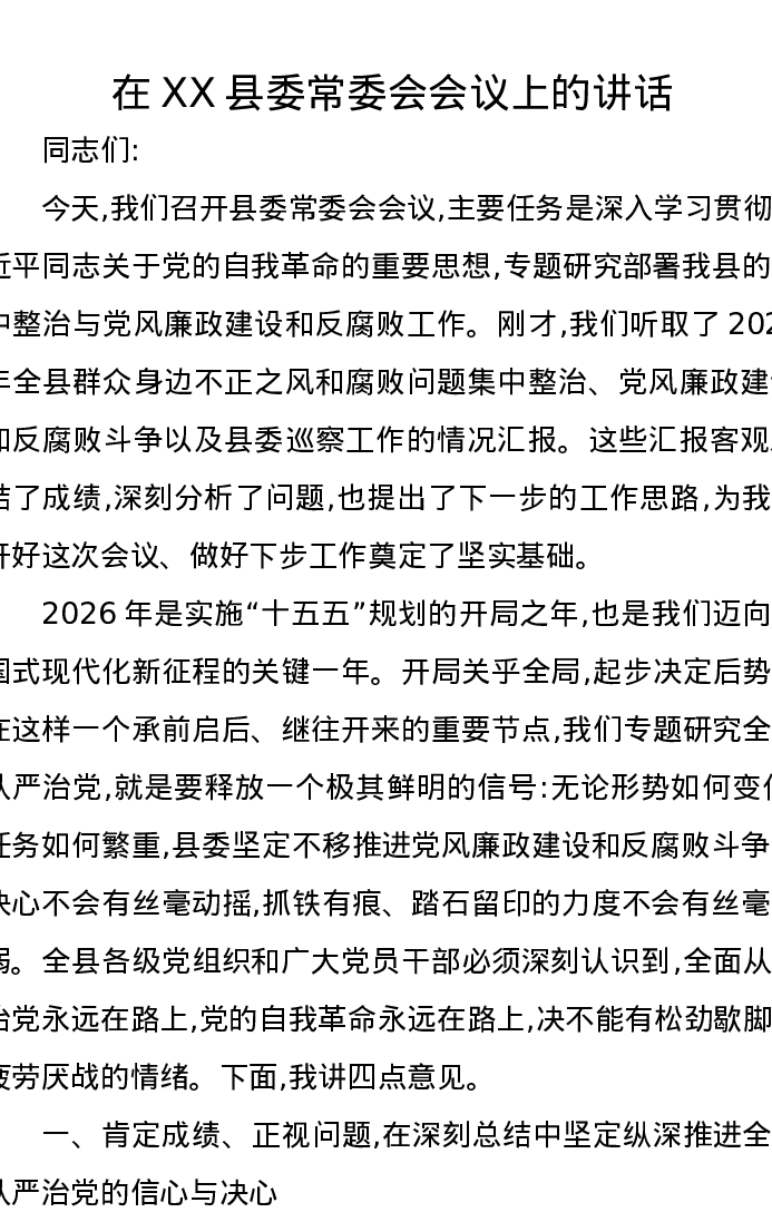 在XX县委常委会会议上的讲话2