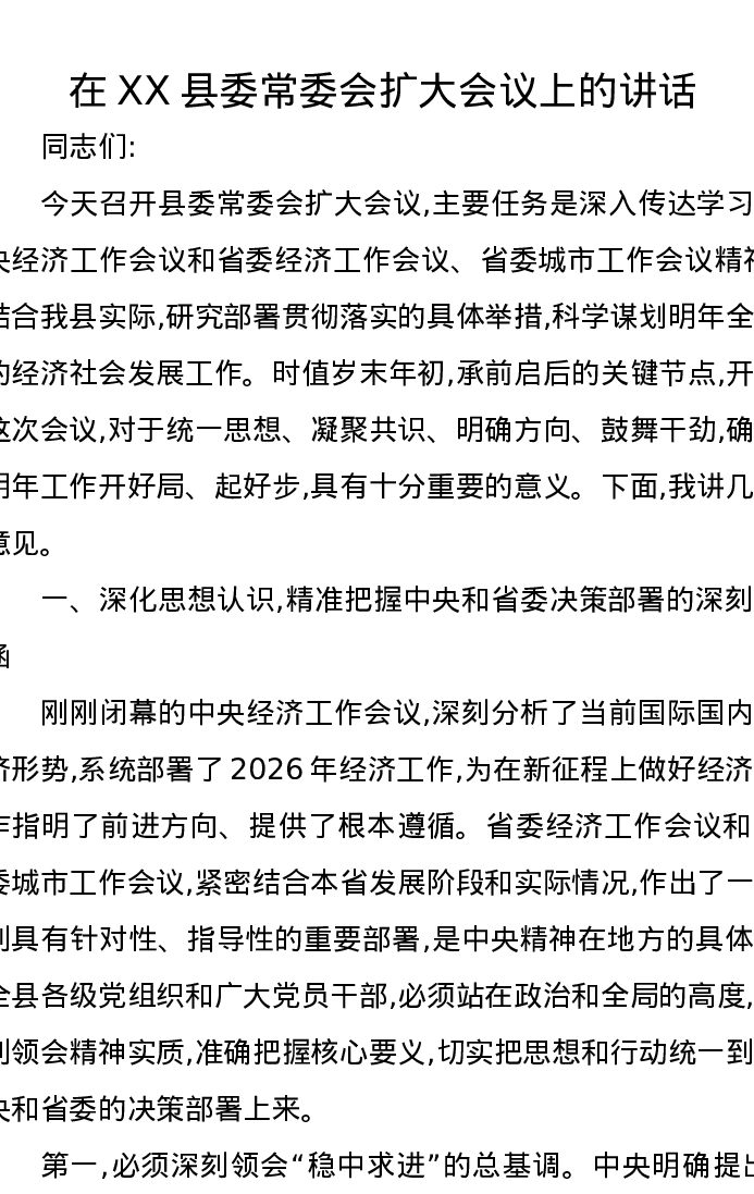 在XX县委常委会扩大会议上的讲话2