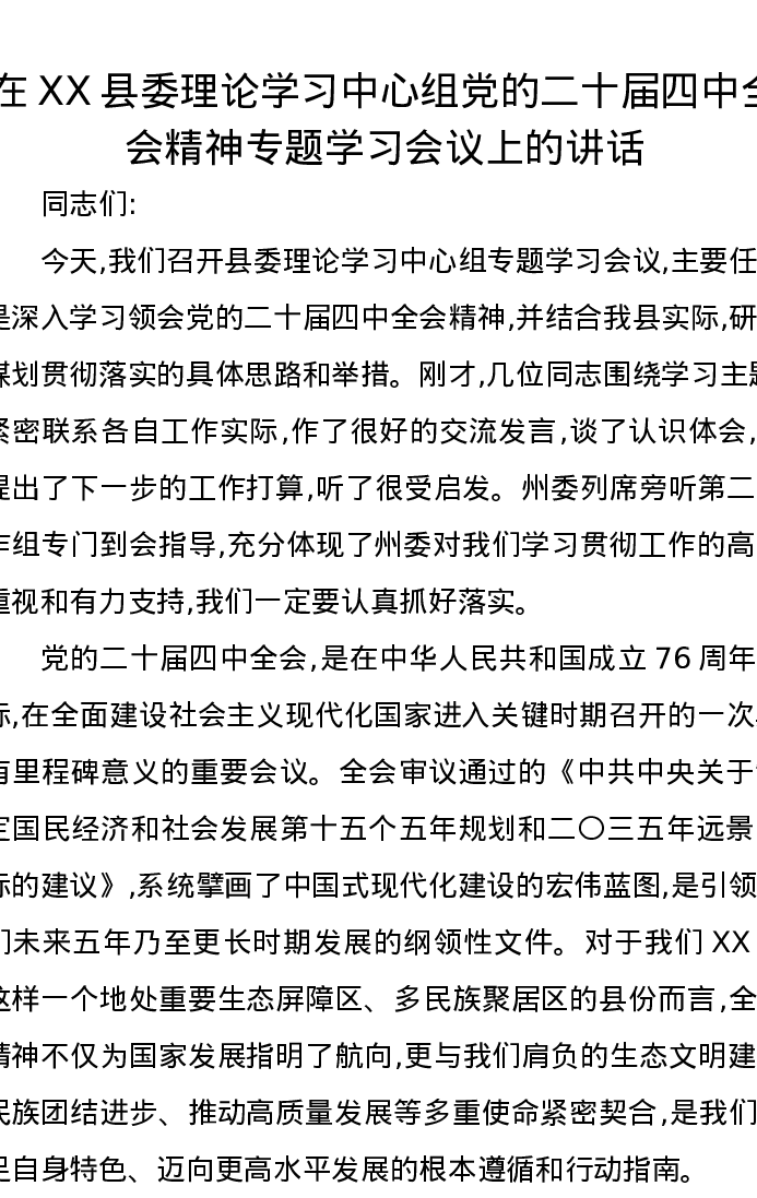 在XX县委理论学习中心组党的二十届四中全会精神专题学习会议上的讲话