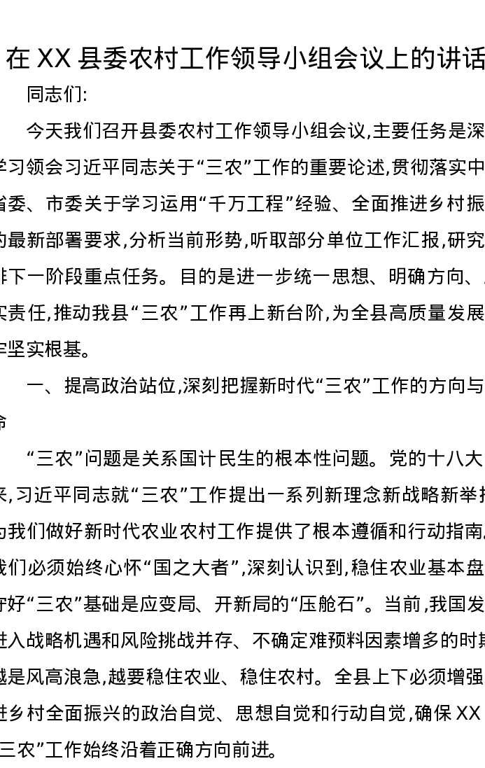 在XX县委农村工作领导小组会议上的讲话