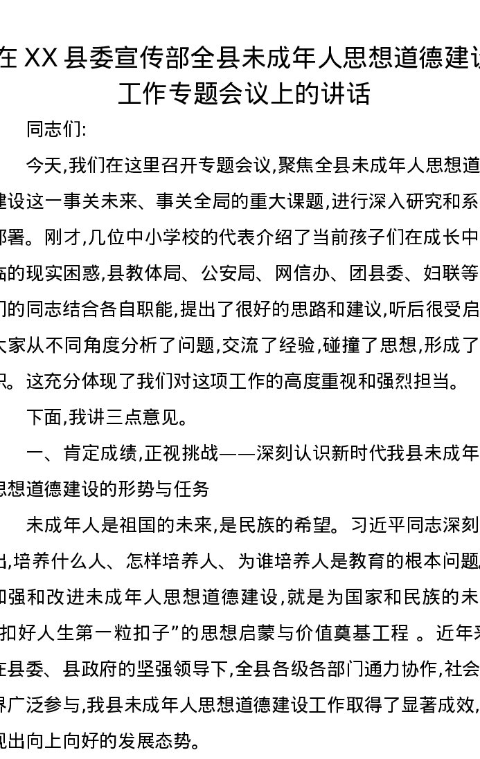 在XX县委宣传部全县未成年人思想道德建设工作专题会议上的讲话