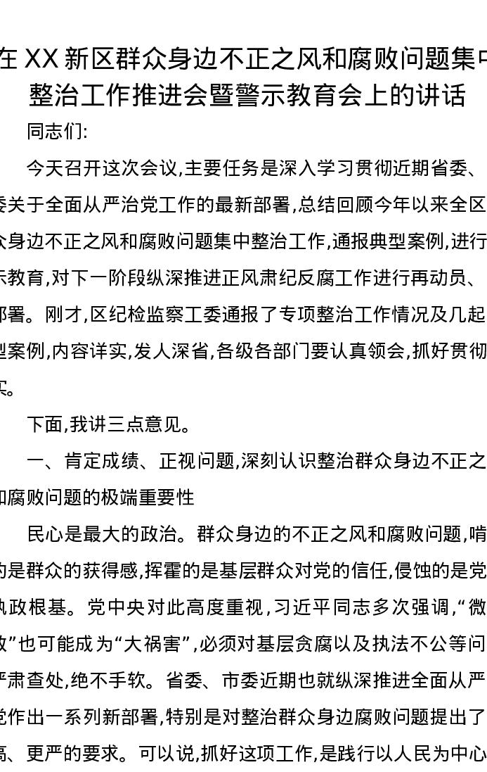 在XX新区群众身边不正之风和腐败问题集中整治工作推进会暨警示教育会上的讲话