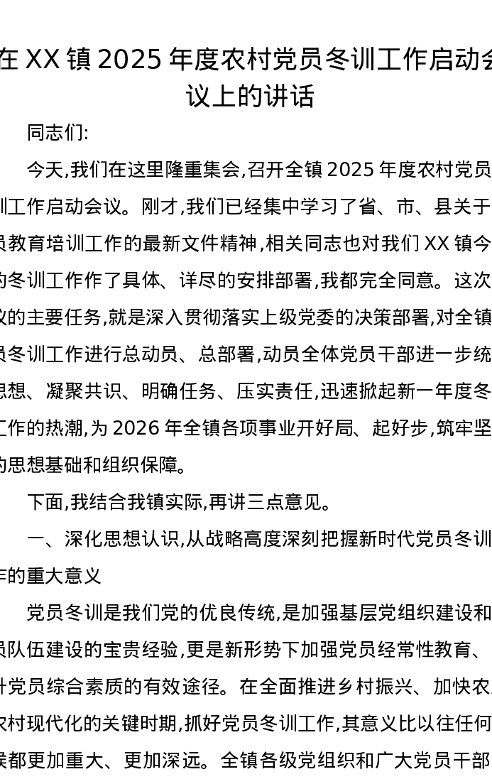 在XX镇2025年度农村党员冬训工作启动会议上的讲话