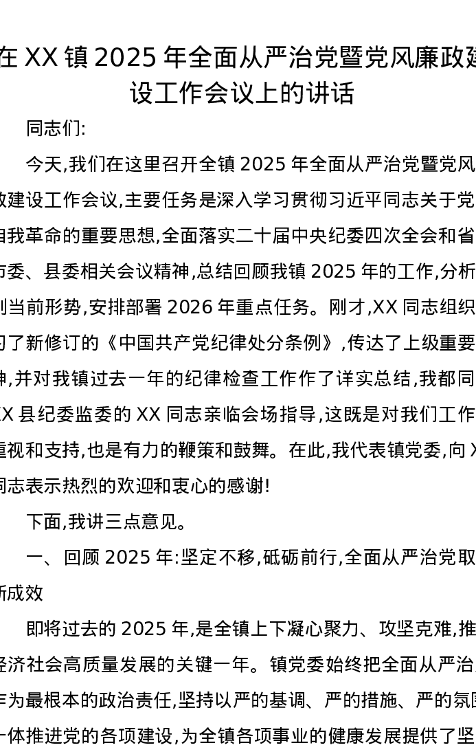 在XX镇2025年全面从严治党暨党风廉政建设工作会议上的讲话