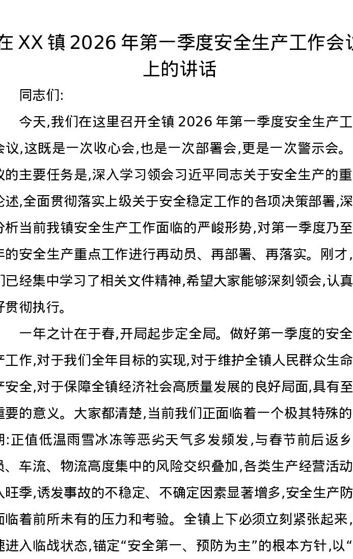 在XX镇2026年第一季度安全生产工作会议上的讲话