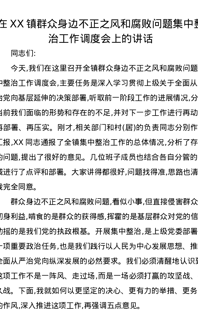 在XX镇群众身边不正之风和腐败问题集中整治工作调度会上的讲话