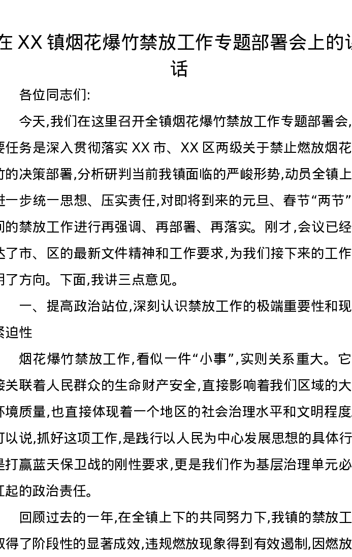 在XX镇烟花爆竹禁放工作专题部署会上的讲话