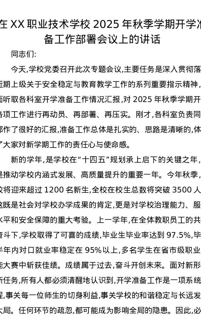 在XX职业技术学校2025年秋季学期开学准备工作部署会议上的讲话