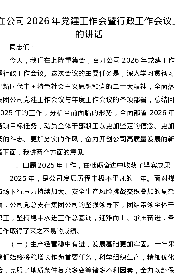 在公司2026年党建工作会暨行政工作会议上的讲话