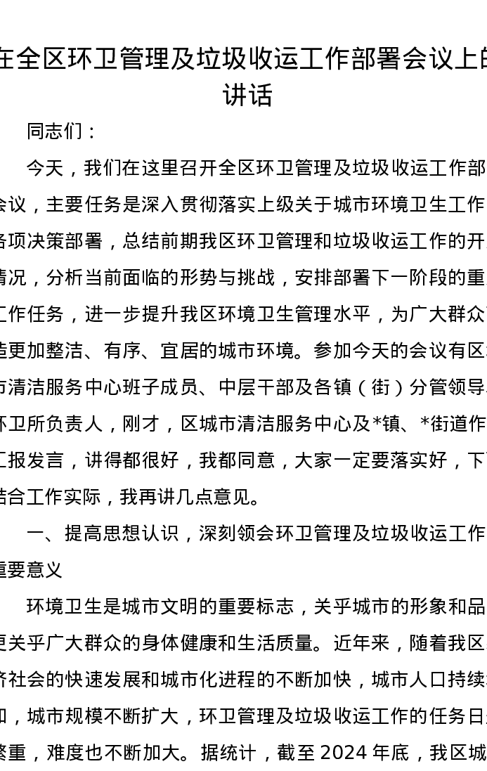 在全区环卫管理及垃圾收运工作部署会议上的讲话