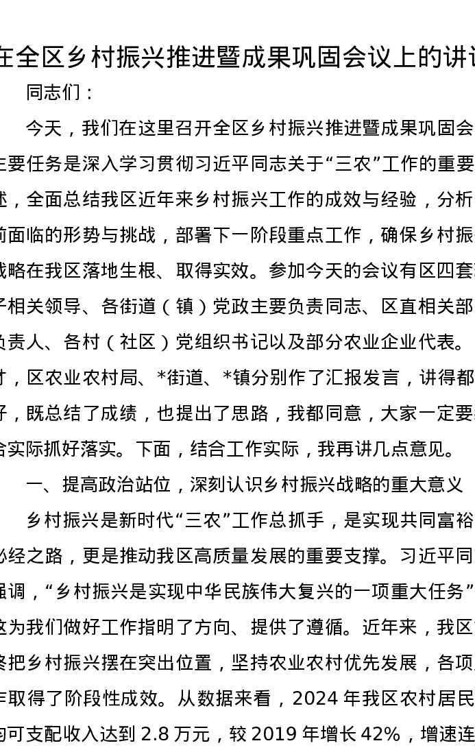 在全区乡村振兴推进暨成果巩固会议上的讲话