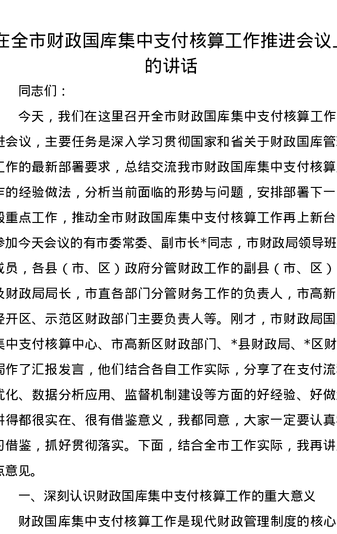 在全市财政国库集中支付核算工作推进会议上的讲话