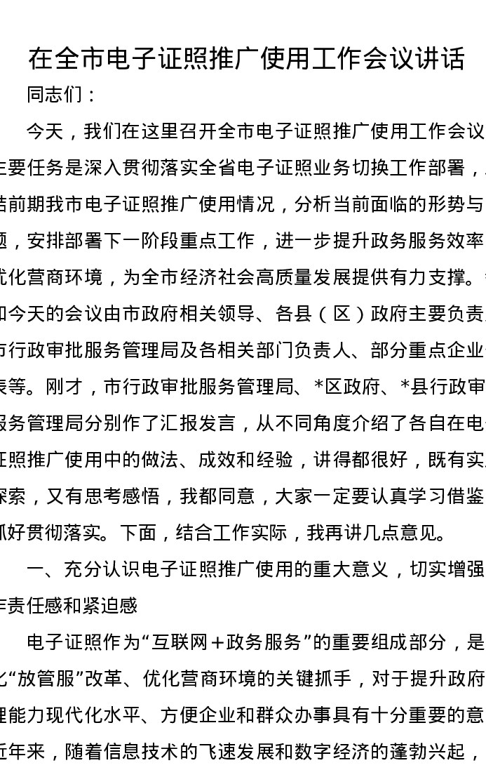 在全市电子证照推广使用工作会议讲话