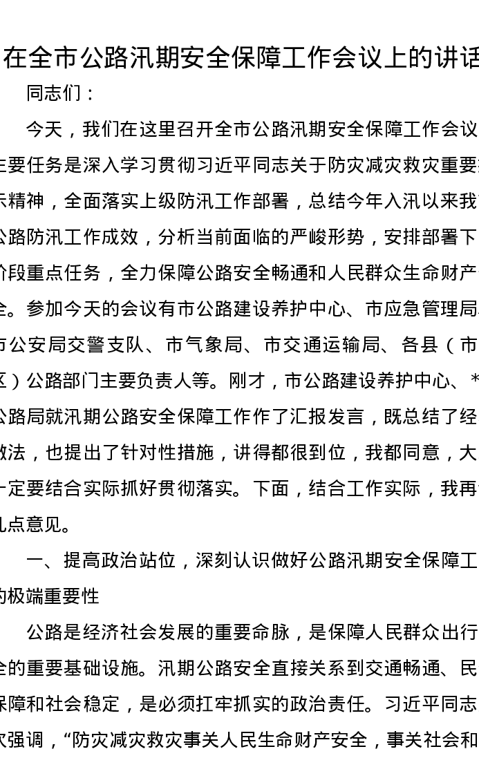 在全市公路汛期安全保障工作会议上的讲话