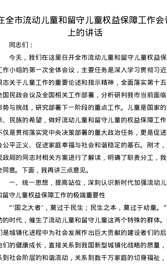 在全市流动儿童和留守儿童权益保障工作会议上的讲话