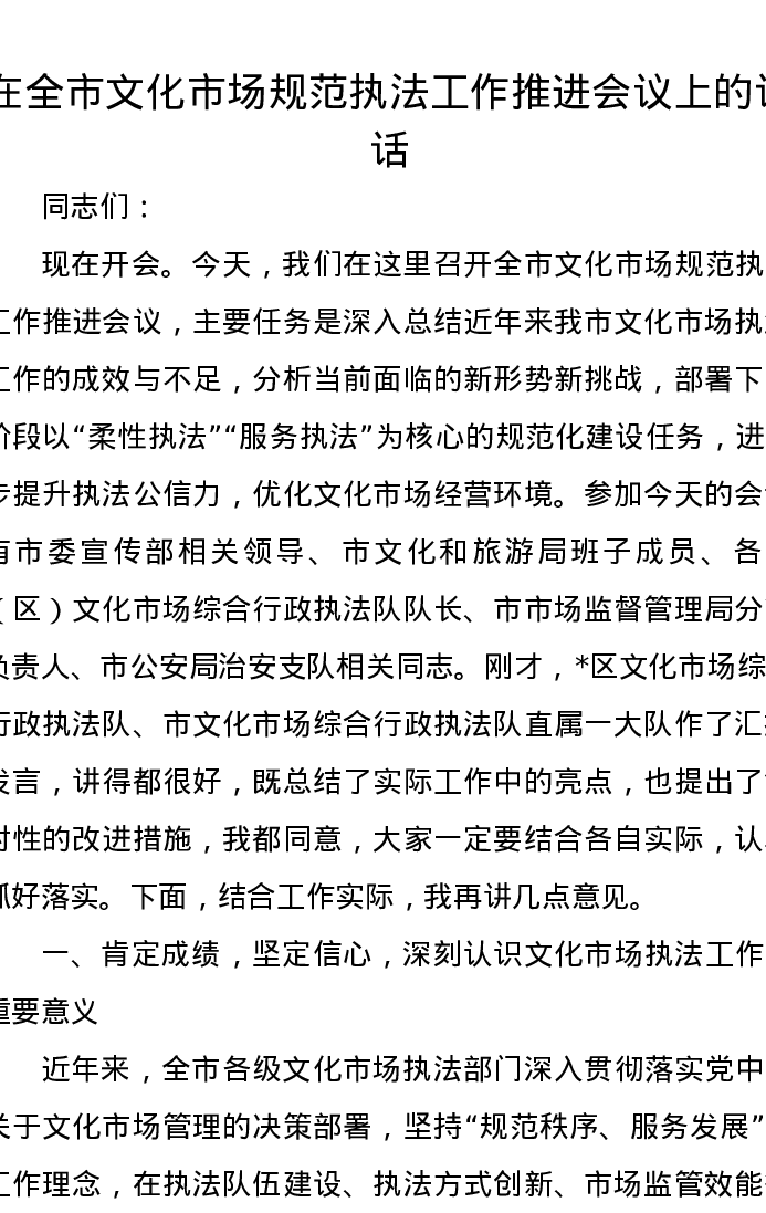 在全市文化市场规范执法工作推进会议上的讲话