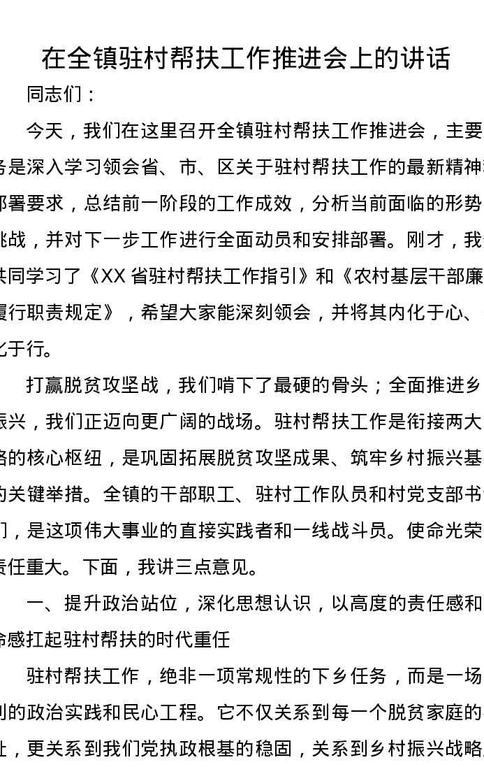在全镇驻村帮扶工作推进会上的讲话