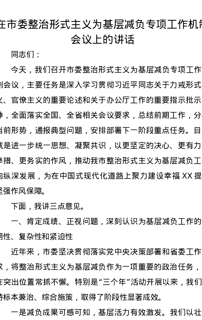 在市委整治形式主义为基层减负专项工作机制会议上的讲话